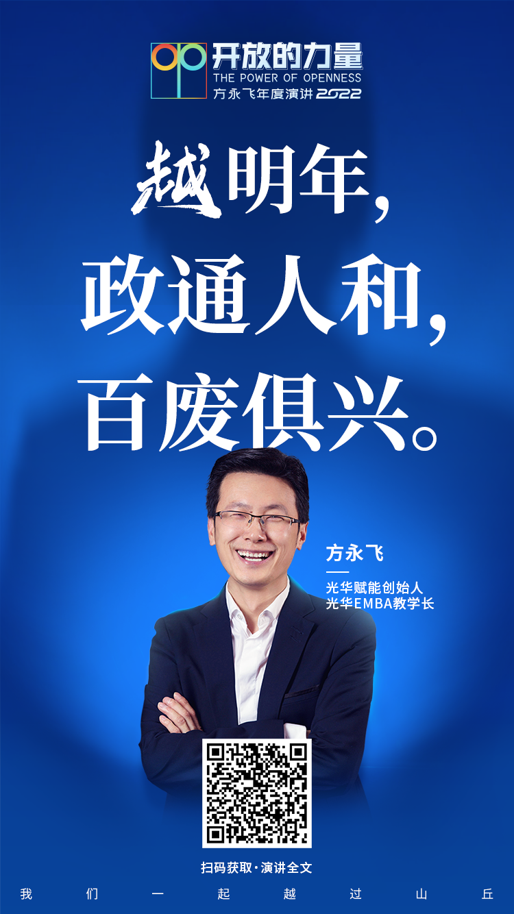 今年“开放的力量”演讲主题为“我们一起,越过山丘”,光华赋能董事长、光华—共创会EMBA教学长方永飞从跨越鸿沟、穿越虚实、超越自我3大方向,干货输出,全场高能,既有宏观商业思考,也有具体案例分析,带领大家走向春暖花开的时代。